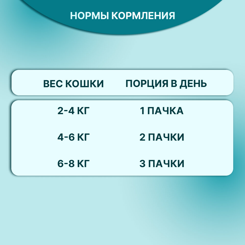 | Дозировка | для взрослой кошки среднего веса (4 кг) требуется 3-4 пакетика в день |