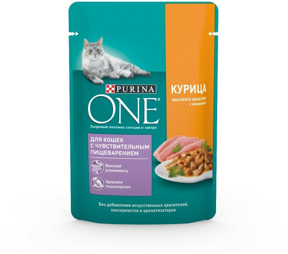 Корм для кошек PURINA ONE с чувствительным пищеварением, курица с морковью пауч 75г (упаковка - 26 шт)