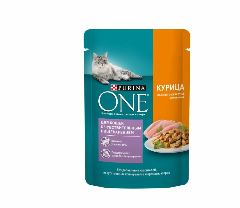 Корм для кошек PURINA ONE с чувствительным пищеварением, курица с морковью пауч 75г (упаковка - 26 шт)