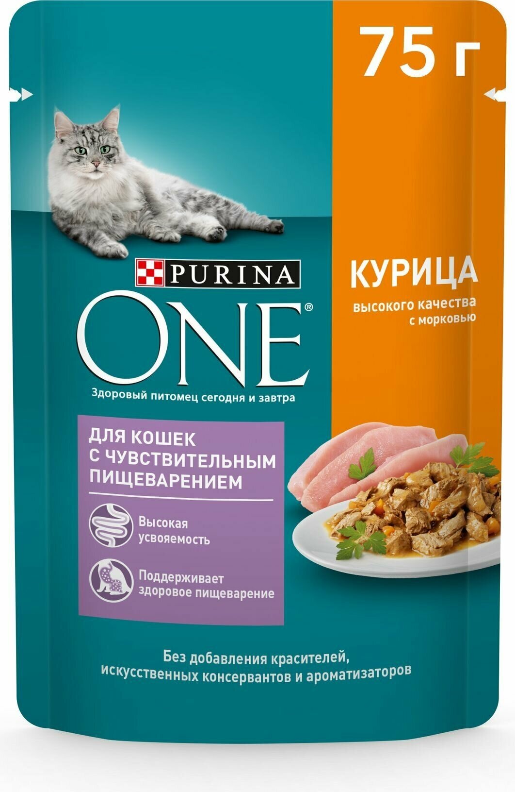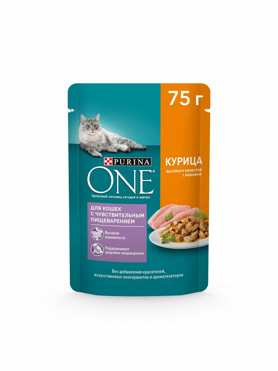 Корм для кошек PURINA ONE с чувствительным пищеварением, курица с морковью пауч 75г (упаковка - 26 шт)
