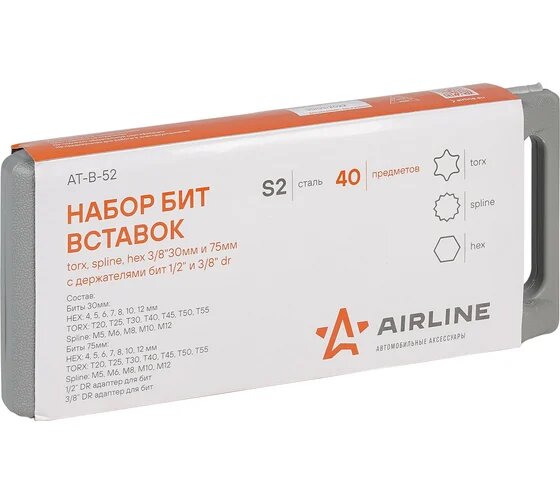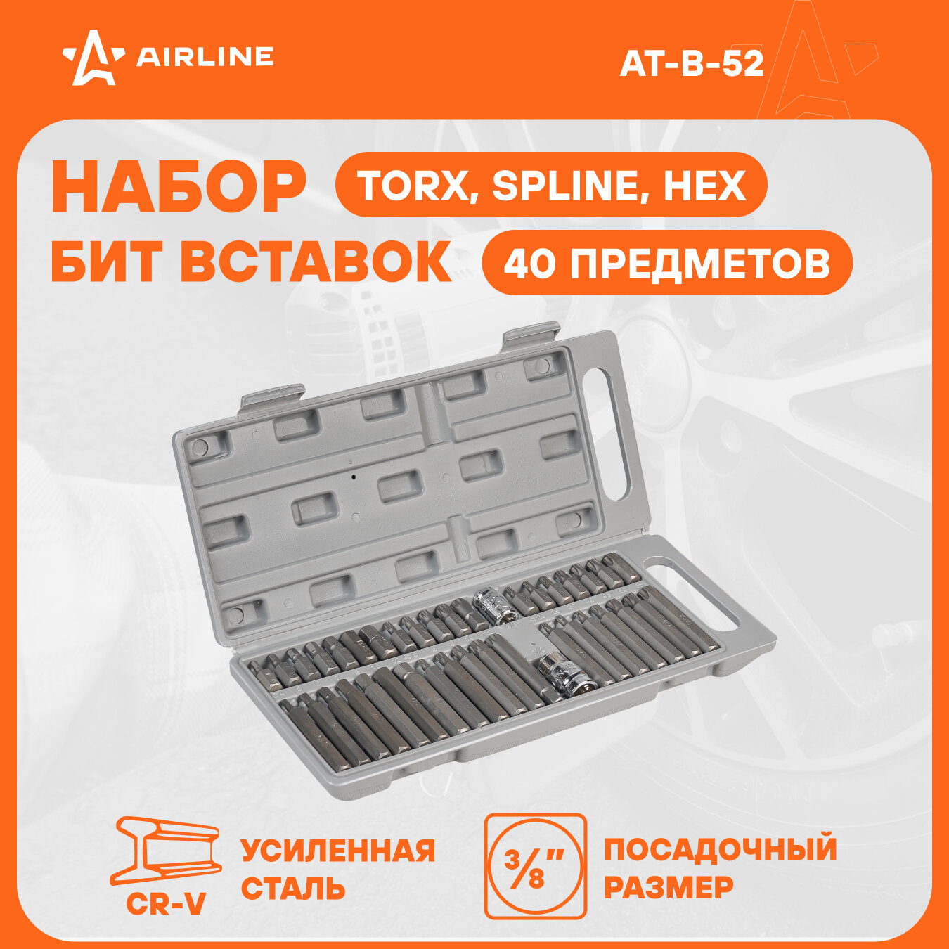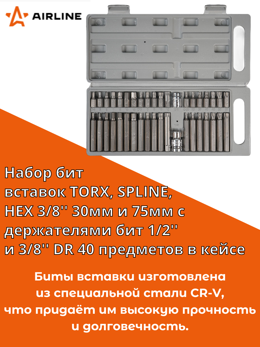 AIRLINE AT-B-52 Набор бит вставок TORX, SPLINE, HEX 3/8 30 мм и 75 мм с держателями бит 1/2 и 3/8 DR 40 предметов в ке AIRLINE ATB52