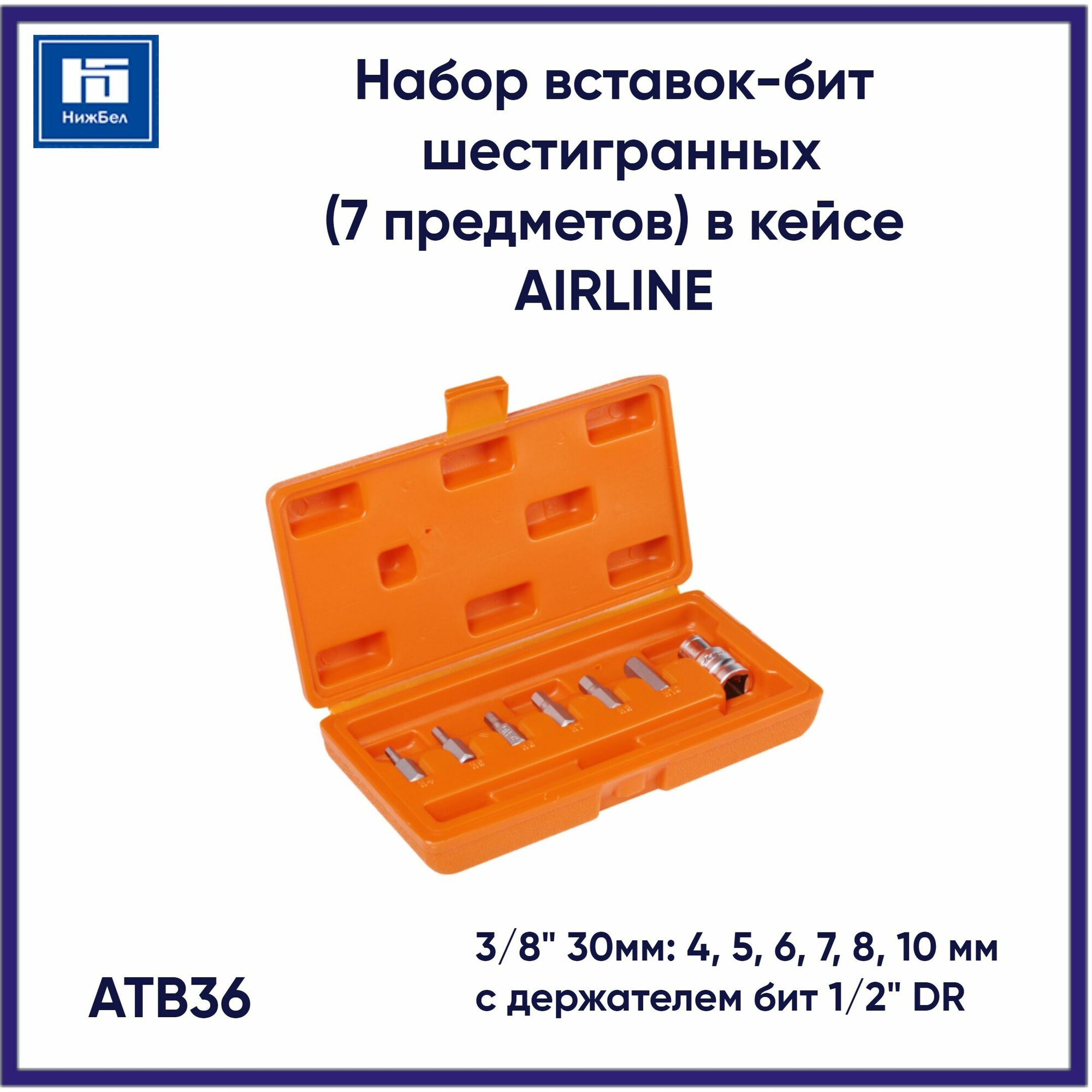 Набор бит вставок шестигранных 3/8 30мм с держателем бит 1/2 DR 7 пред.в кейсе, ATB36 AIRLINE AT-B-36