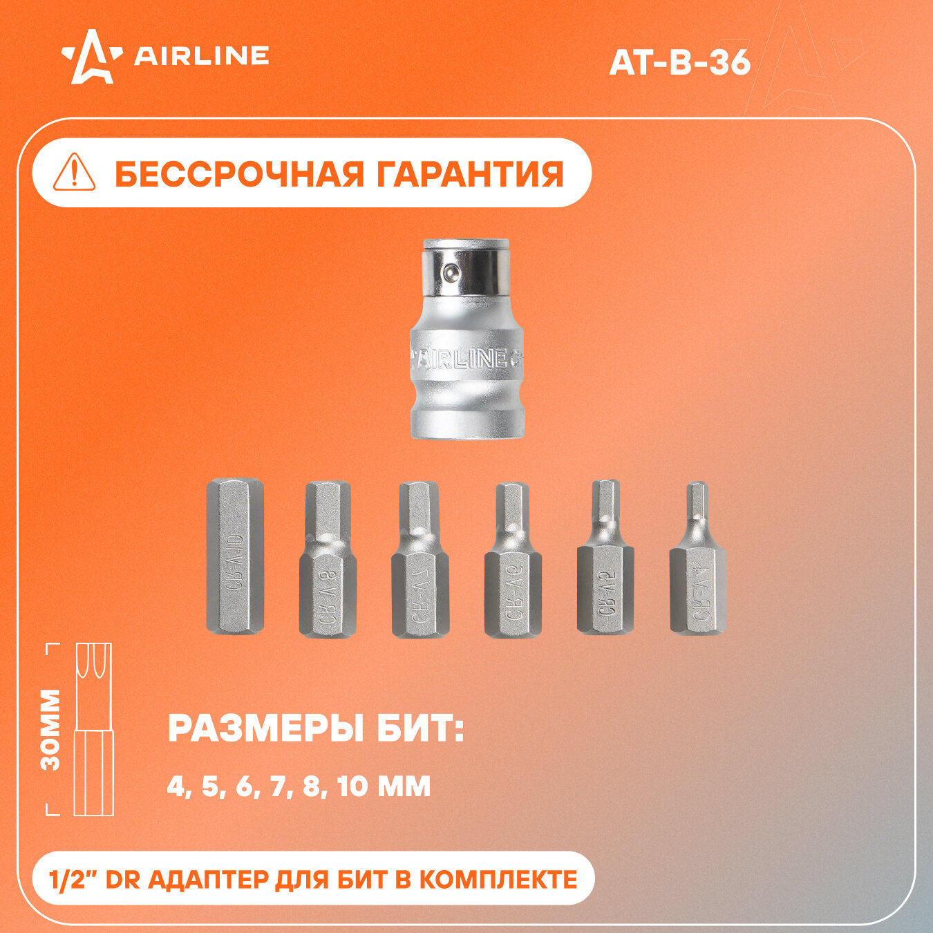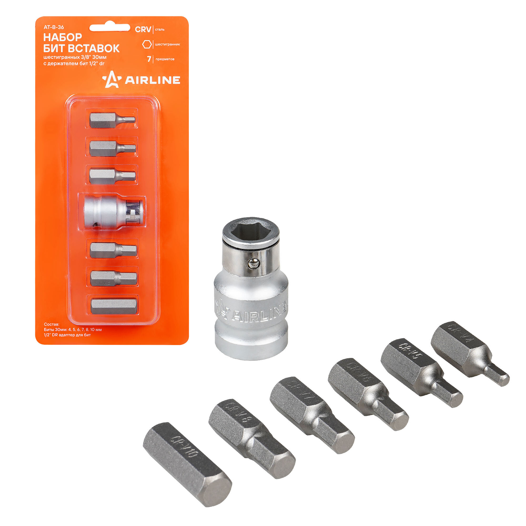 AIRLINE AT-B-36 (ATB36) набор бит вставок шестигранных 3 / 8 30мм с держателем бит 1 / 2 dr 7 предметов