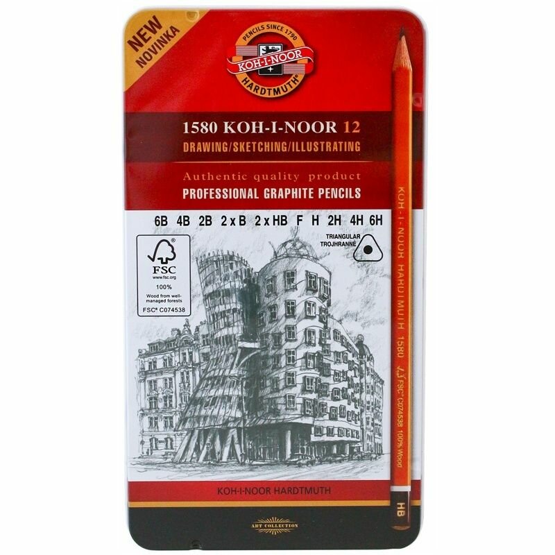 Набор чернографитных (простых) карандашей Koh-I-Noor 1582 (6B-6H, трехгранный, заточенные) метал.пенал, 12шт. (1582012001PL)