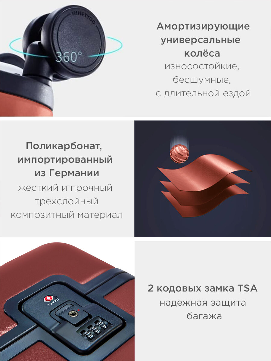 | Отзыв: | Ну в целом ставлю 5 звезд. У чемодана поликарбонатный корпус, толстая металлическая ручка с несколькими регулировками, легкий вес, и никакого брака. |