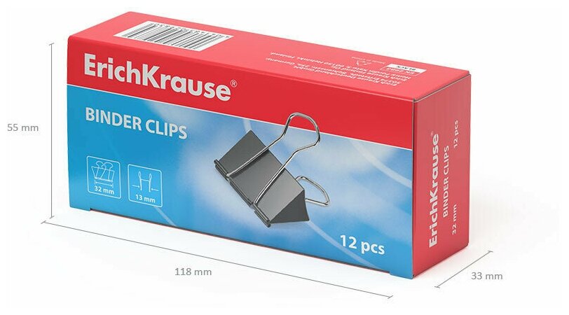 ErichKrause Набор зажимов для бумаг 32 мм, 12 штук, в картонной коробке, чёрные, Erich Krause