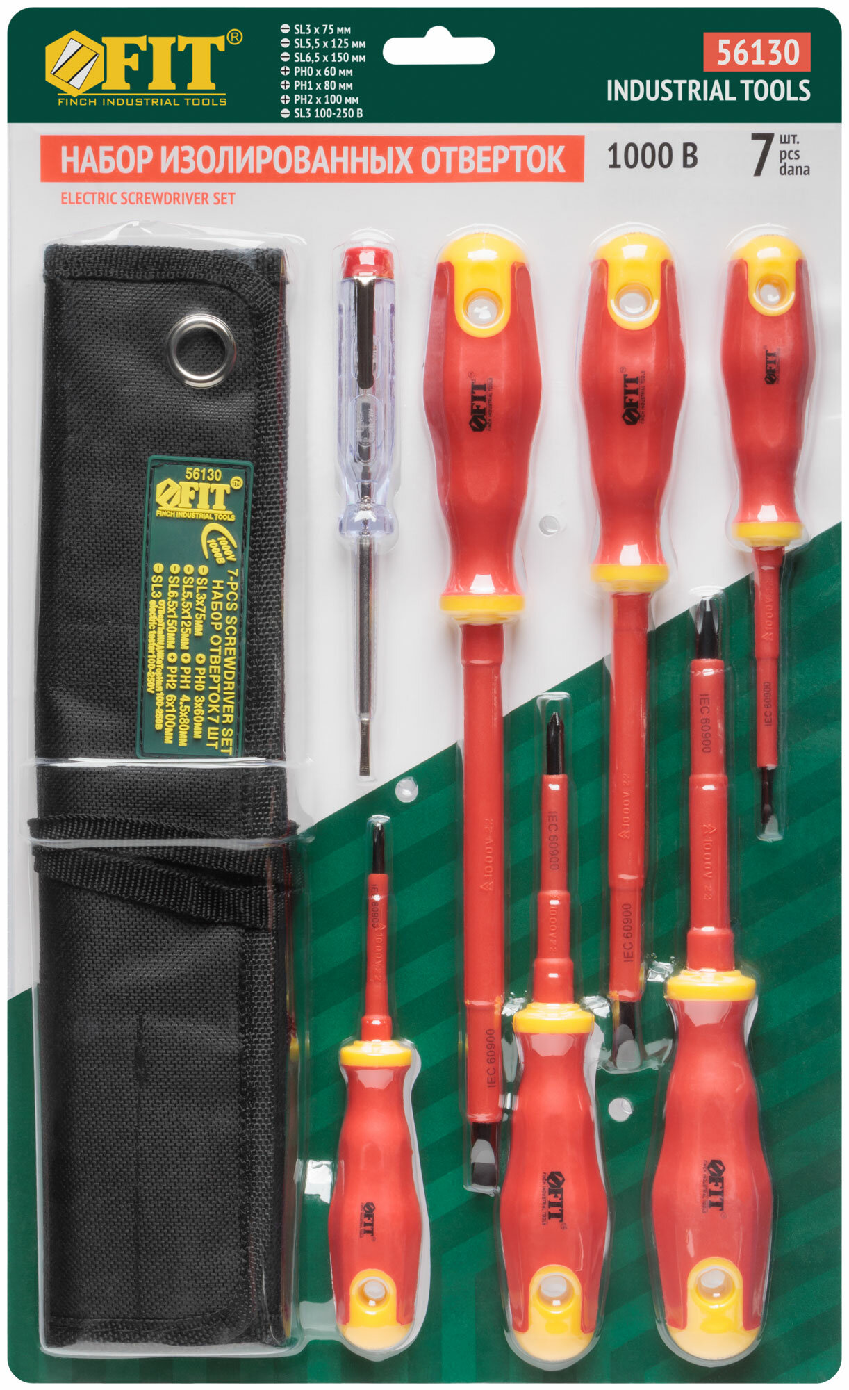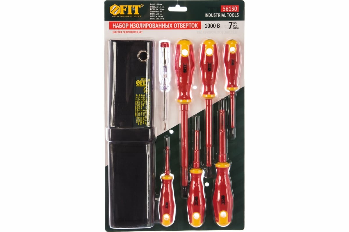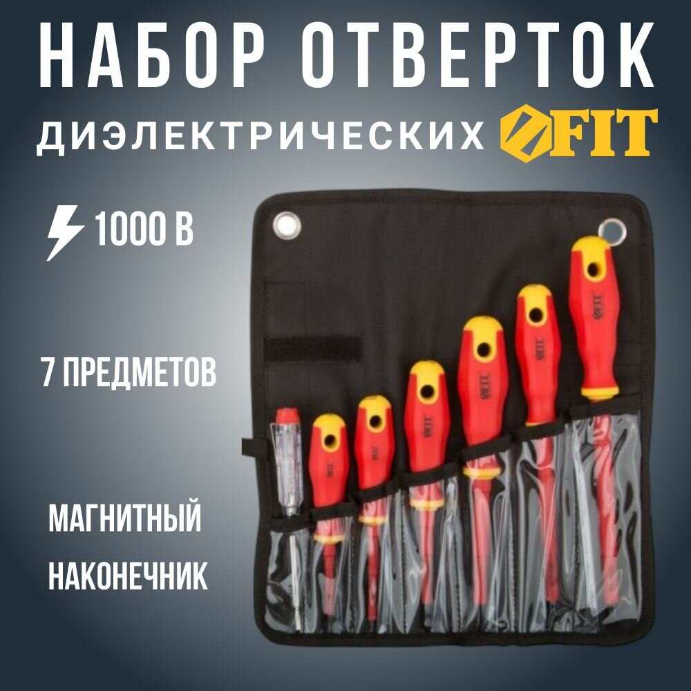 Отвертки изолированные 1000 В, CrV сталь, прорезин. ручки, в нейлоновом конверте, 6 шт+ 1 индикаторная | код 56130 | FIT (1 шт.)