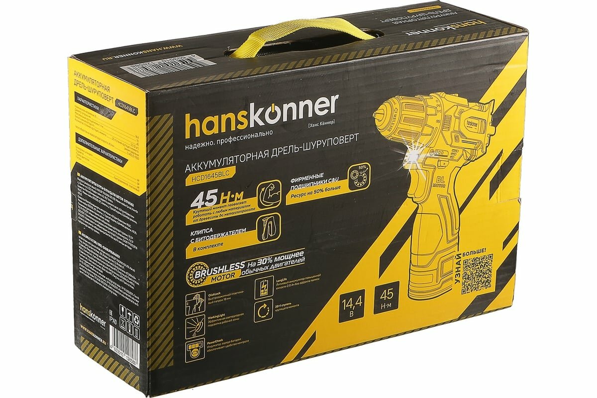 Дрель-шуруповерт Hanskonner HCD1645BLC аккумуляторная бесщеточная (14.4В, 2акк*2,0А/ч, 45Н/м, сумка-кейс)