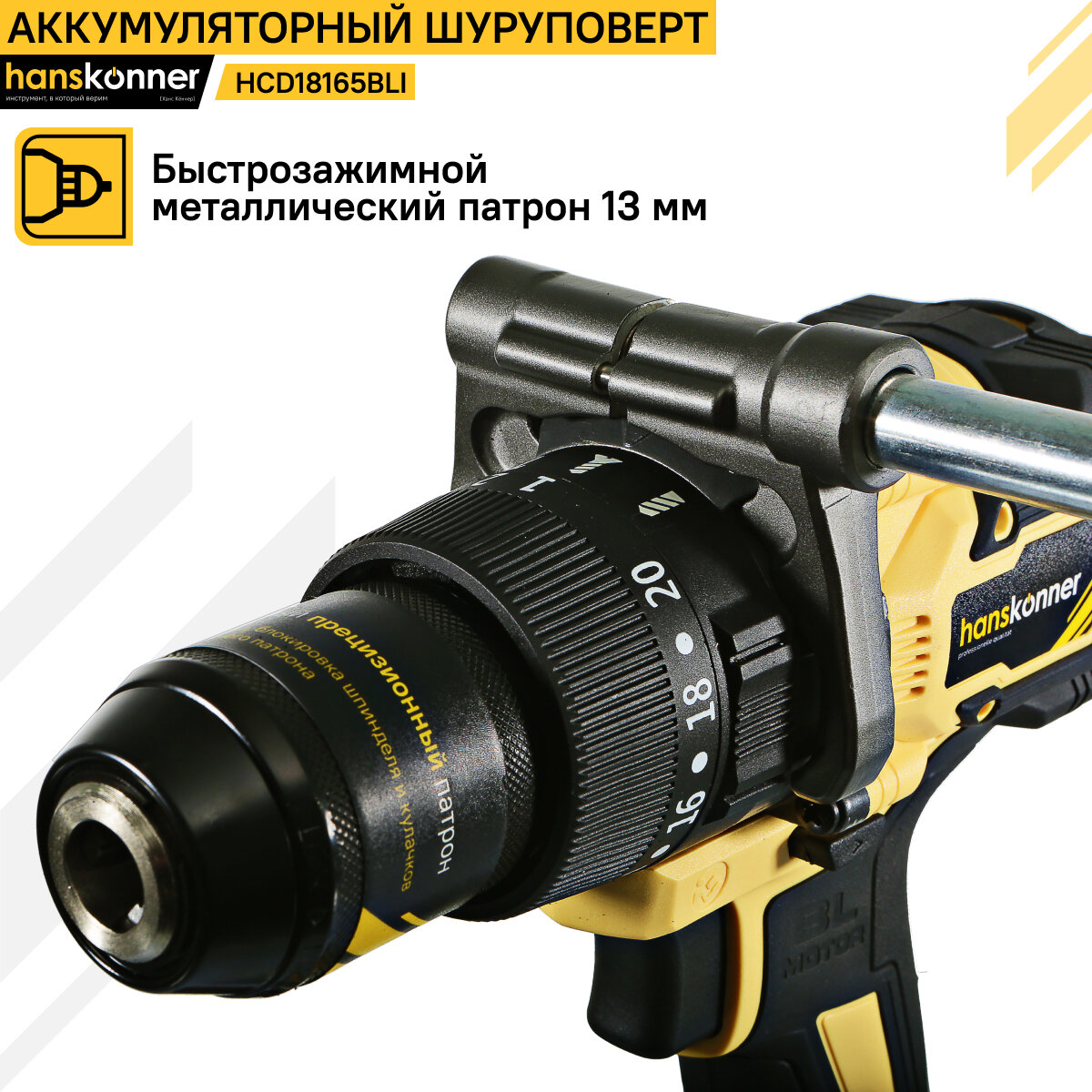 Аккумуляторный шуруповерт Hanskonner HCD20165PRO 1BatterySystem (18 В, 165 Нм, 2.0+4.0 Ач, SAMSUNG, 13мм, кейс HS)