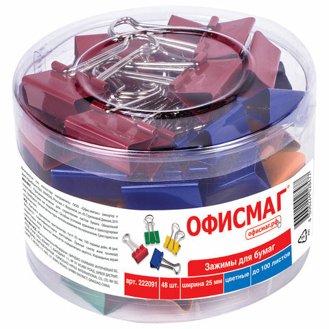 Зажимы для бумаг офисмаг, комплект 48 шт., 25 мм, на 100 листов, цветные, в пластиковом цилиндре, 222091 - 1 шт.