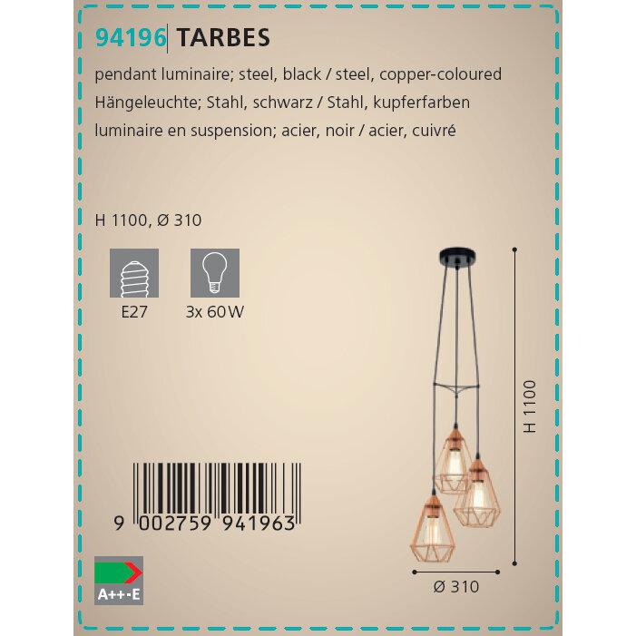 Eglo Подвес TARBES, 3x60W (E27), Ø310, H1100, сталь, пластик, медный, черный кабель 94196