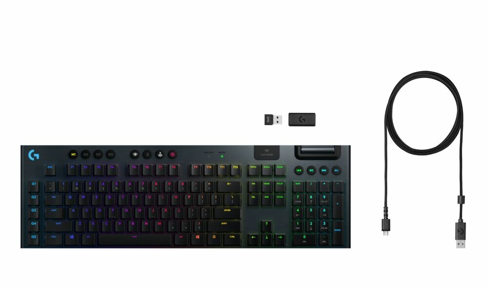 | Дополнительная информация | технология беспроводной связи LIGHTSPEED, время отклика 1 мс; 5 программируемых G-клавиш; встроенная память: 2 профиля подсветки, 3 профиля макросов для G-клавиш, колесико регулировки громкости; комплект поставки: беспроводная механическая игровая клавиатура G915, USB-приемник LIGHTSPEED, удлиненный USB-кабель, кабель микро-USB, документация пользователя; полная зарядка батареи занимает 3 часа; клавиатуру, подключенную с помощью кабеля microUSB, можно заряжать непосредственно во время игры; RGB-подсветка по технологии LIGHTSYNC с возможностью настройки для каждой клавиши |