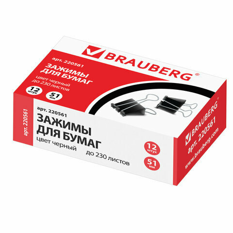 Купить Зажимы для бумаг большие BRAUBERG, комплект 12 шт., 51 мм, на 230 листов, черные, картонная коробка, 220561