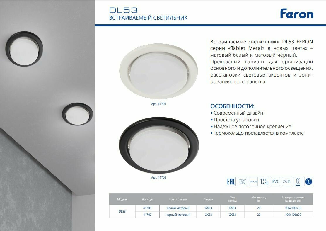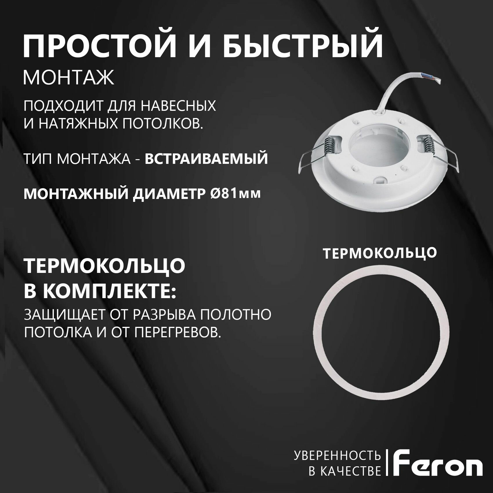 Светильник потолочный встраиваемый, точечный под сменяемую лампу GX53, FERON DL53, белый матовый