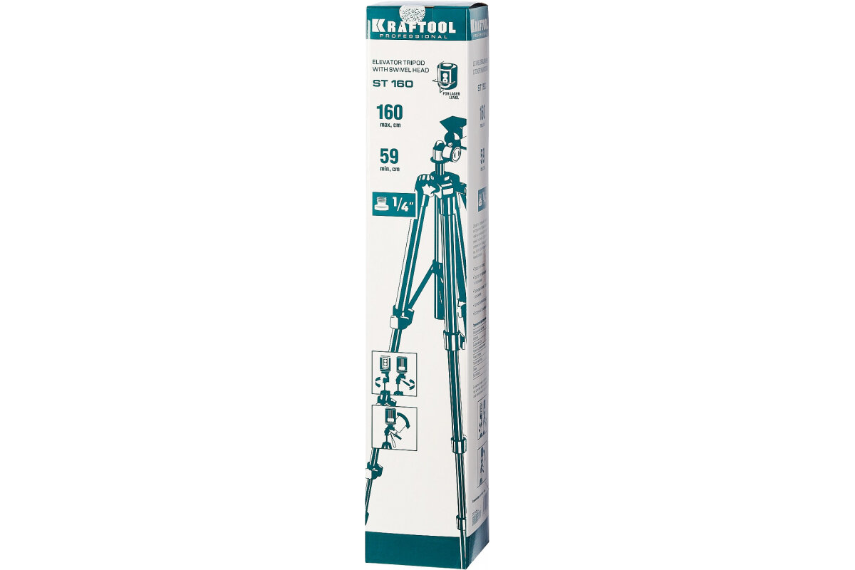 KRAFTOOL ST-160 штатив элевационный. Высота 59-160 см. Максимальный вес прибора - 5 кг. Резьба - 1/4. Вес штатива - 1.3 кг. 34714