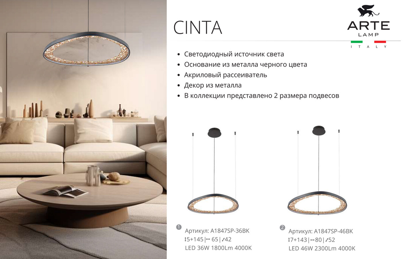 СохранитьПодвесной светодиодный светильник Arte Lamp Cinta A1847SP-46BK, цвет Черный/Черный, материал Металл/Силикон интересное: