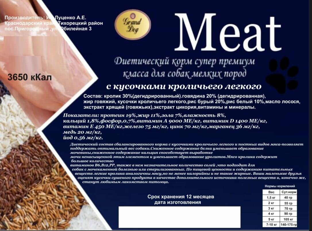 Купить Гранд дог, 3 кг, Meat, Сухой корм премиум класса диетический, для собак мелких пород с кусочками кроличьего легкого