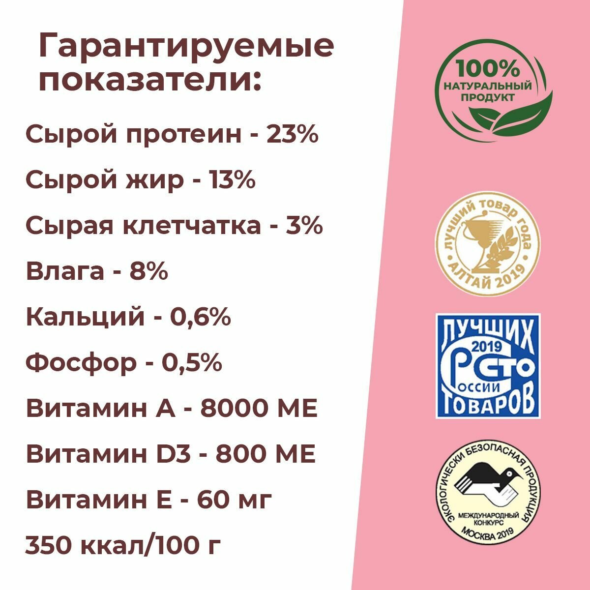 | Пищевая ценность | сырой протеин (белок) 23% (мин.), сырой жир 13% (мин.), сырая клетчатка 3% (макс.), влага 8% (макс.), кальций 0,6% (мин.), фосфор 0,5% (мин.) |