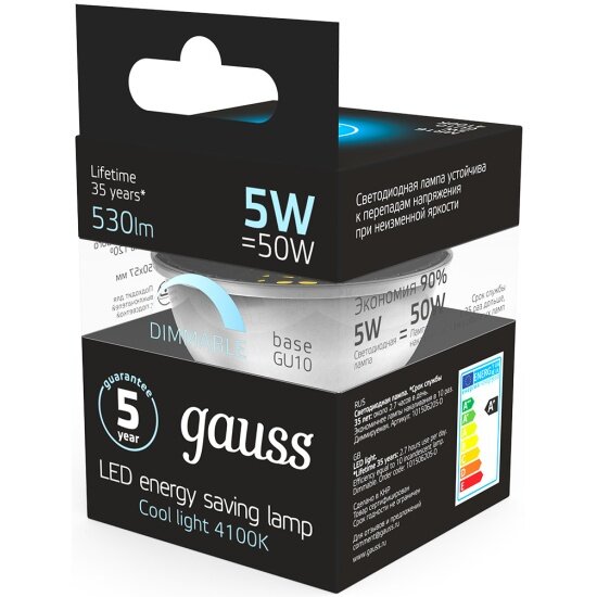GAUSS 101506205-D Лампа Gauss MR16 5W 530lm 4100K GU10 диммируемая LED 1/10/100