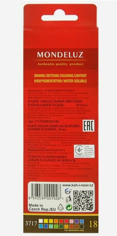 Карандаши цветные акварельные художественные KOH-I-NOOR Mondeluz, 18 цветов, 3,8 мм, заточенные, европодвес, 3717018001KSRU