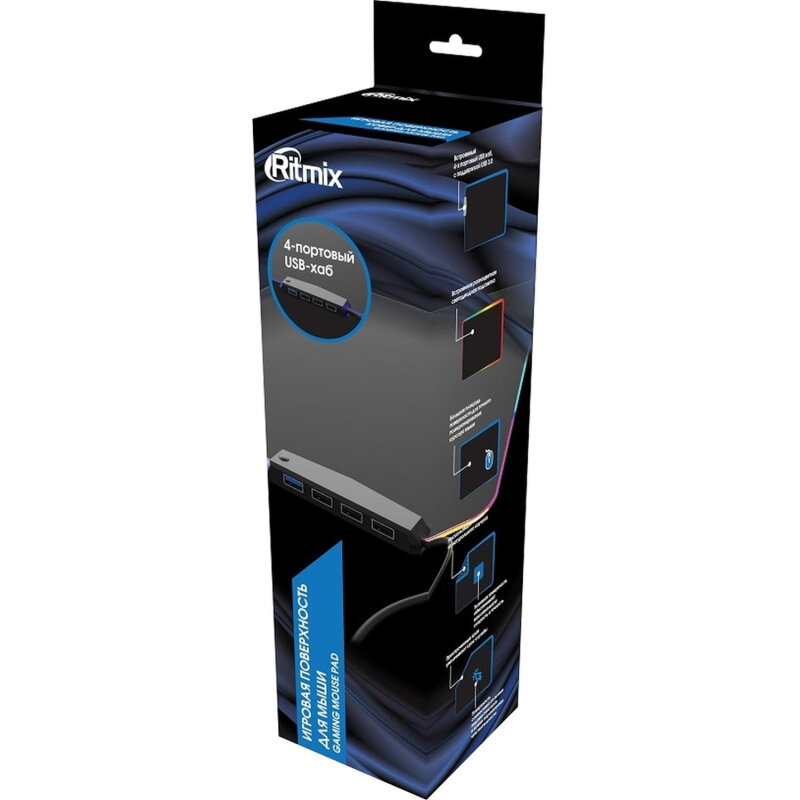 Коврик подсвет. и USB хабом 400x300x3мм, RITMIX MPD-440, для оптич. и лазер.мышей,ткань+рез.осн.1xUSB3.0+3xUSB2.0,встр.каб. USB.