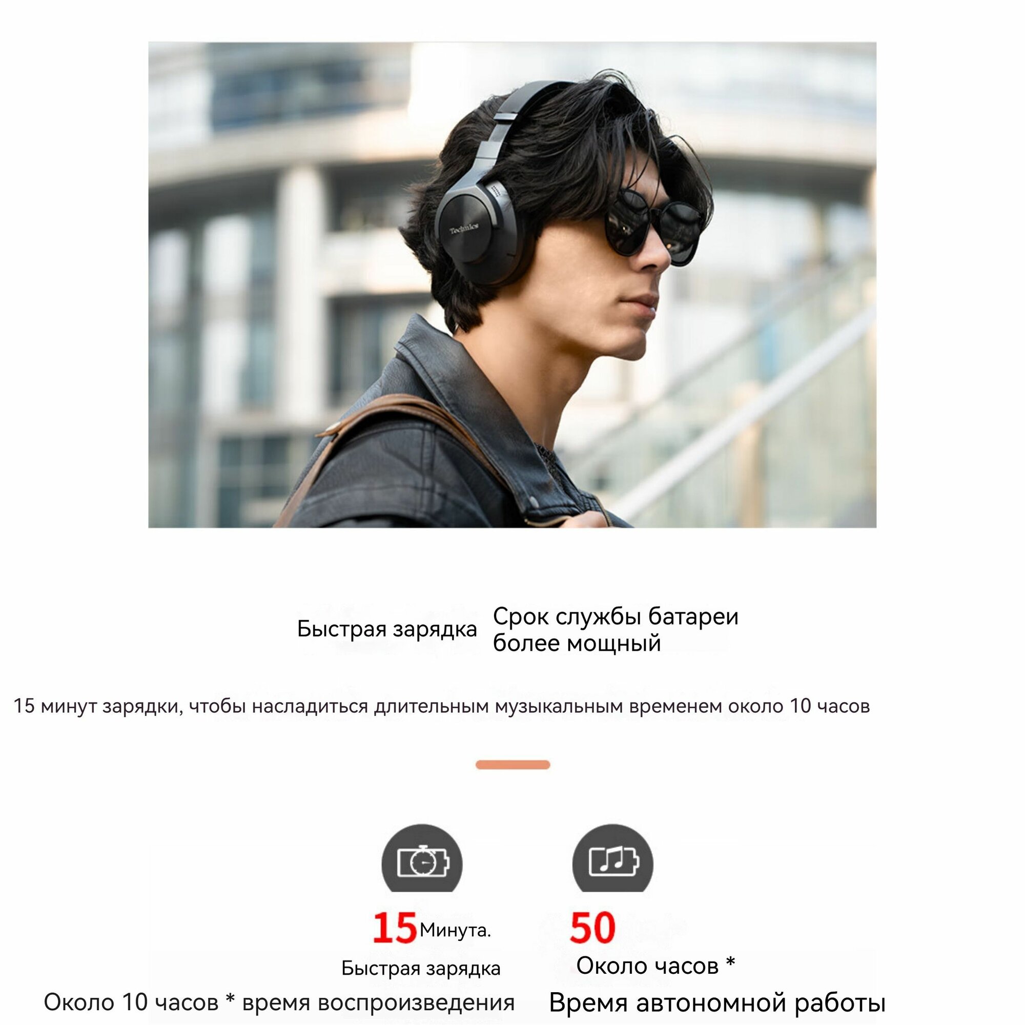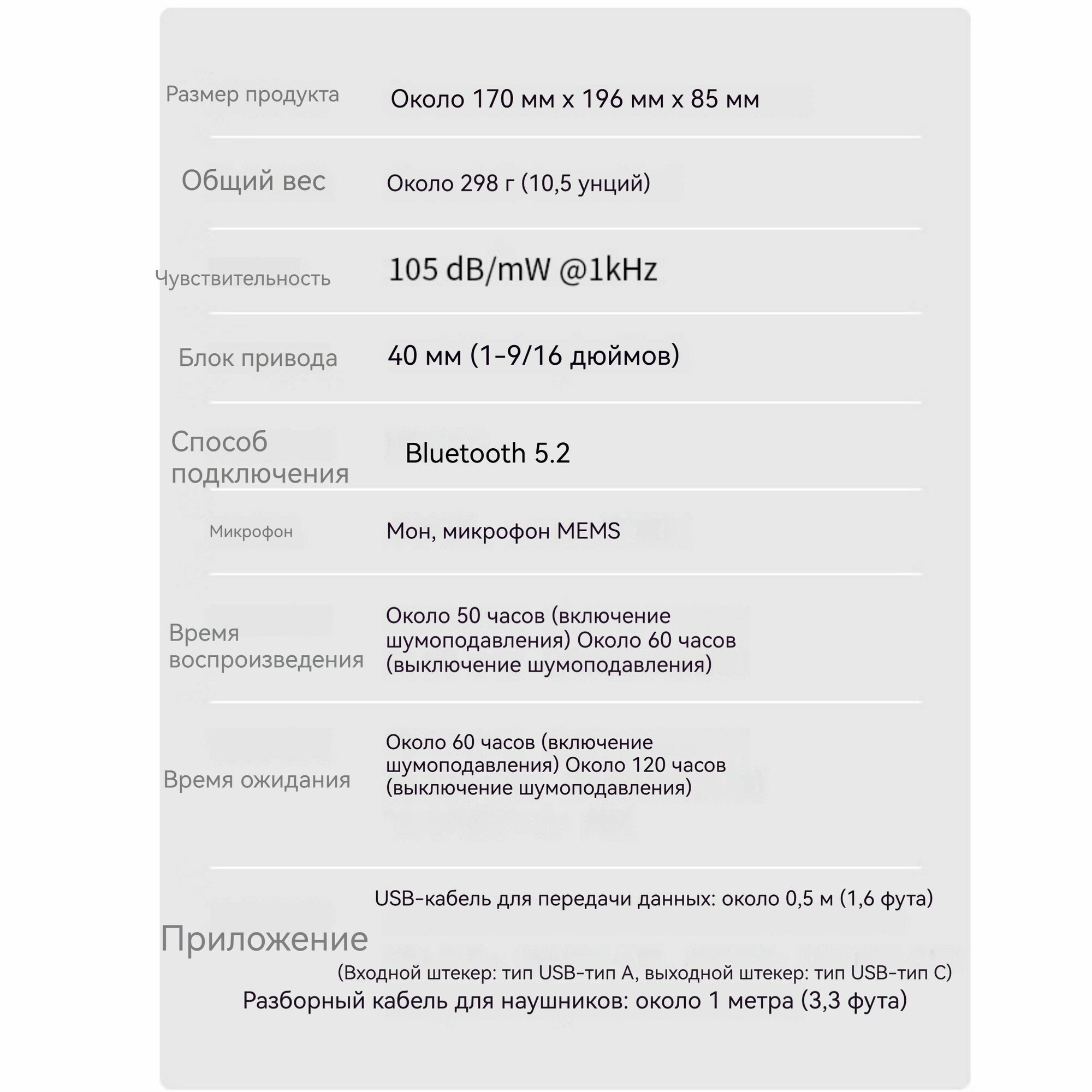 | Время работы с включенным режимом активного шумоподавления | 50 ч |