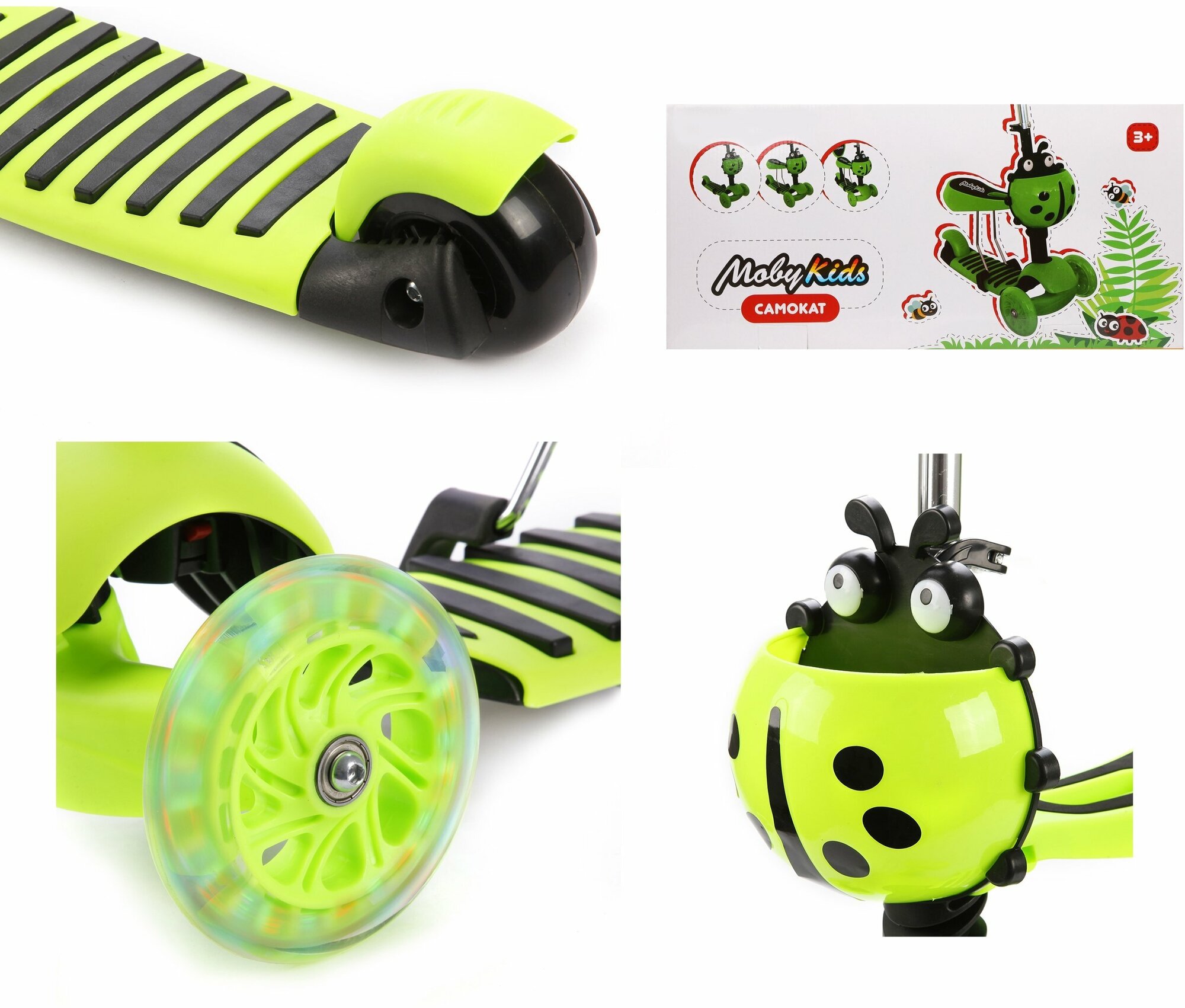 Самокат Moby Kids Божья коровка 3 в 1, световые колеса, зеленый Moby Kids 641274