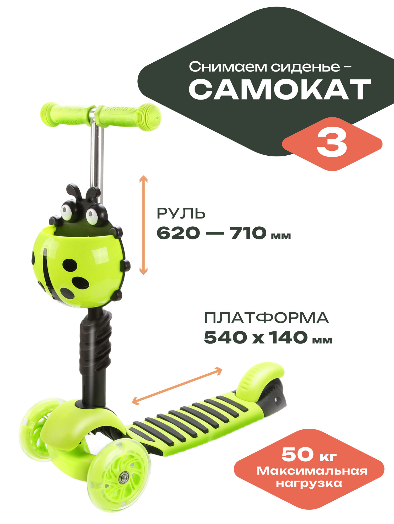 Самокат Moby Kids Божья коровка, 3 в 1, светящиеся колеса, зеленый (641274) интересное: