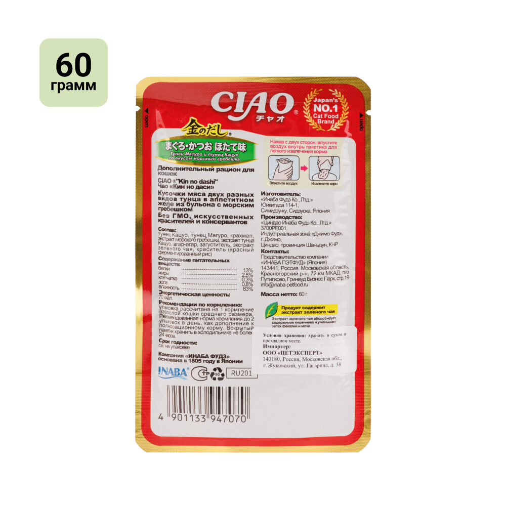 Купить INABA Ciao Kinnodashi пауч для кошек тунец магуро, тунец кацуо со вкусом морского гребешка желе 60г