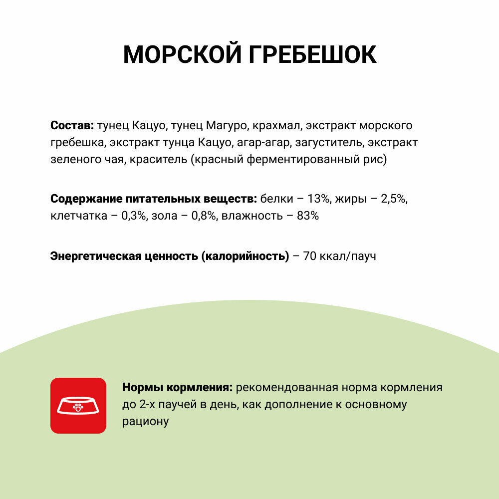 | Состав | гребешок, японский тунец-бонито, желтоперый тунец, экстракт вяленого японского тунца-бонито, морские водоросли, полисахариды, витамин Е, натуральный антиоксидант (экстракт японского чая – катехин) |