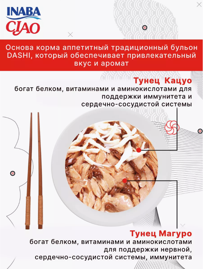 | Состав | японский тунец-бонито, тихоокеанский тунец, парное филе курицы, бульон из японского тунца- бонито, отвар из морской капусты, полисахариды, витамин Е, натуральный антиоксидант (экстракт японского чая – катехин) |
