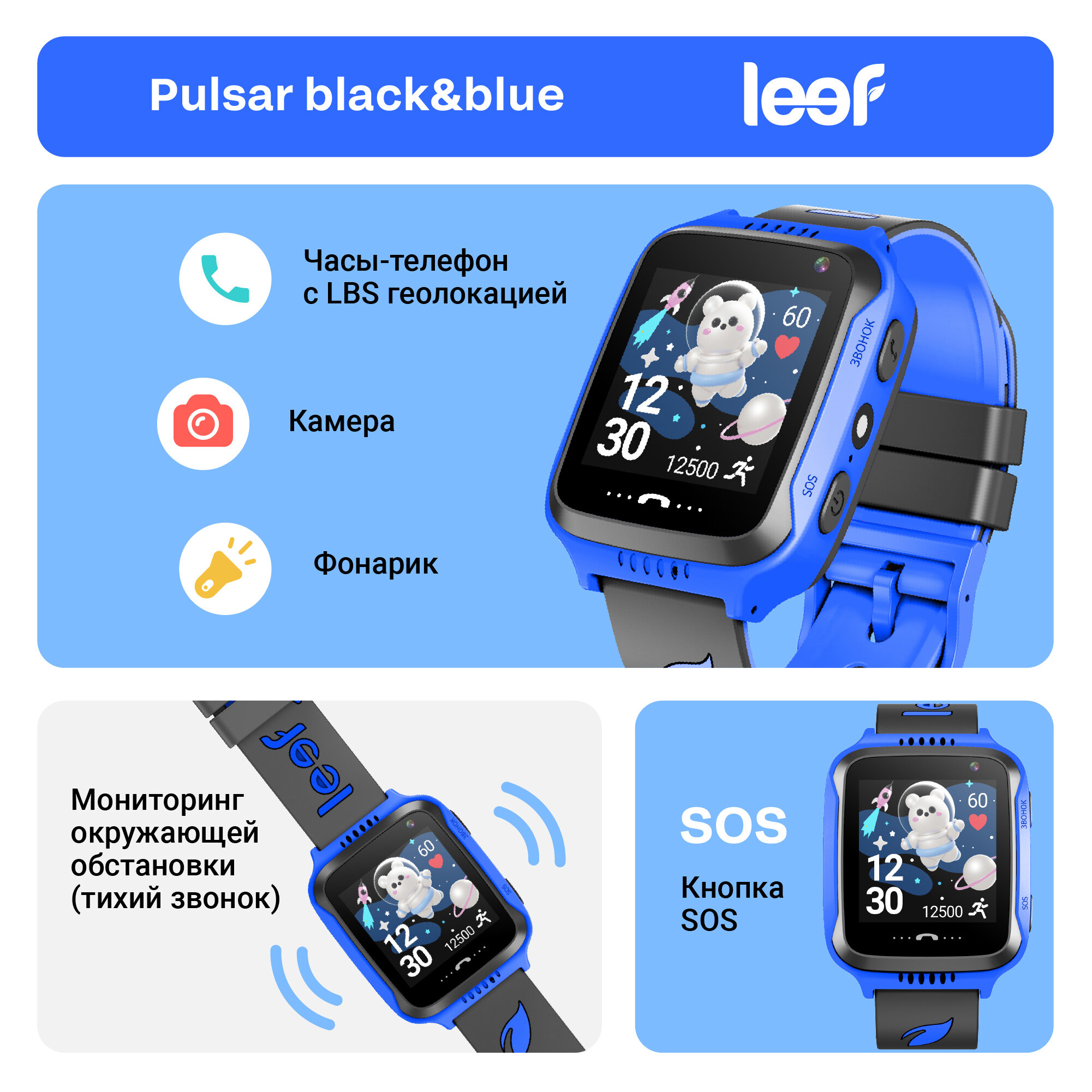 Детские умные часы LEEF Pulsar, цвет черный+синий