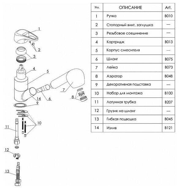 | Комплектация | В комплект к смесителю входит: - Гибкая подводка G1/2, 370 мм, Sedal (Испания) - Выдвижная лейка - Металлический шланг 1500мм - Набор для монтажа |