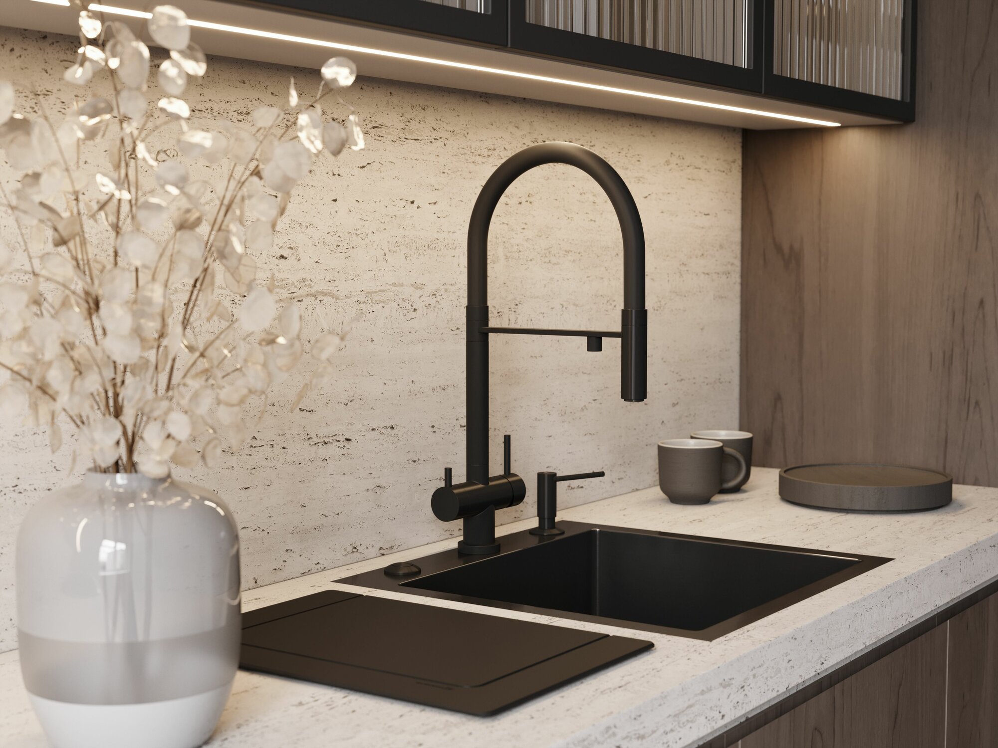 СохранитьСмеситель для кухни OMOIKIRI Kanto-GB с подключением фильтра и гибким изливом / графит / черный шланг интересное: