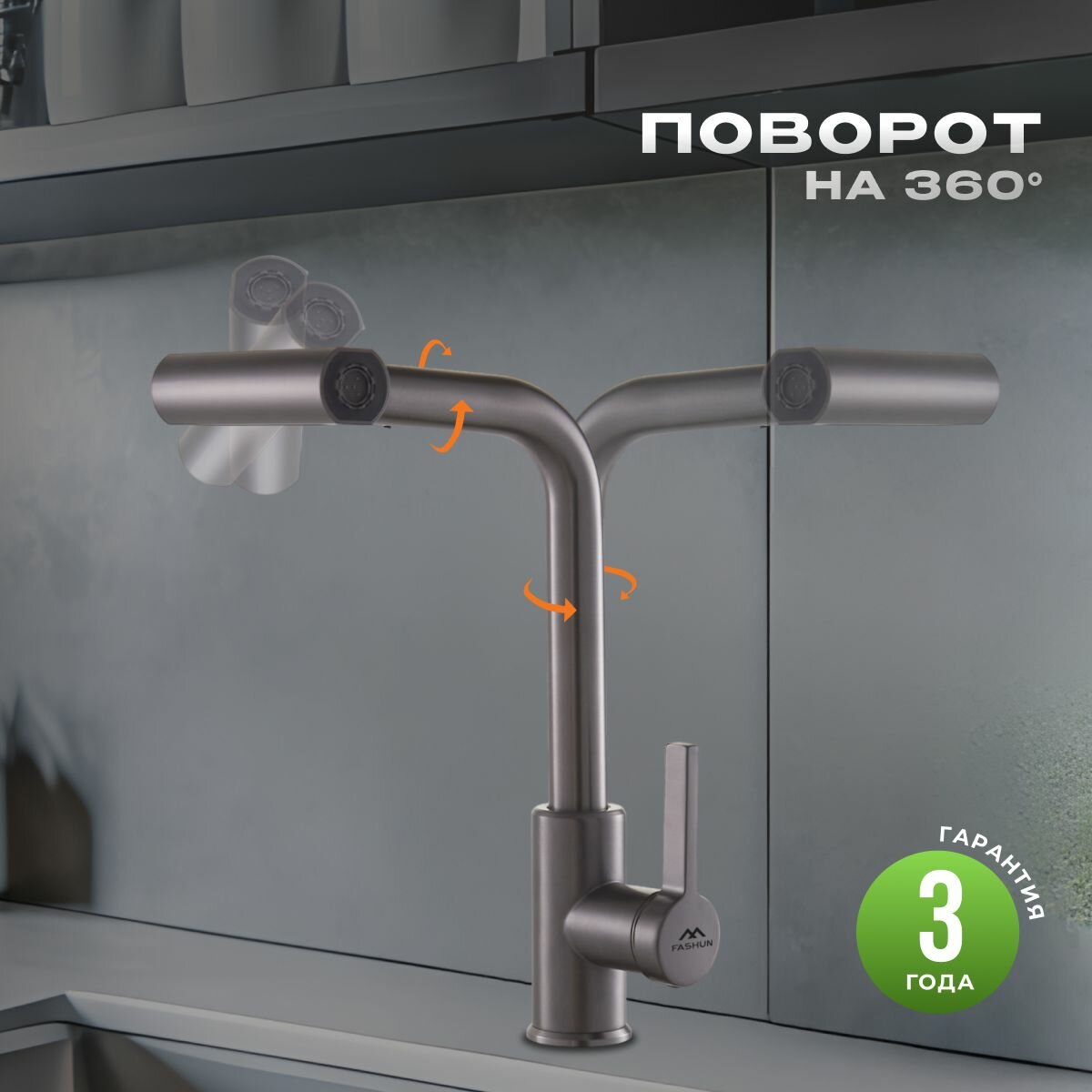 Смеситель для кухни, поворотный, серый, гибкая подводка 45см (Fashun A54001)