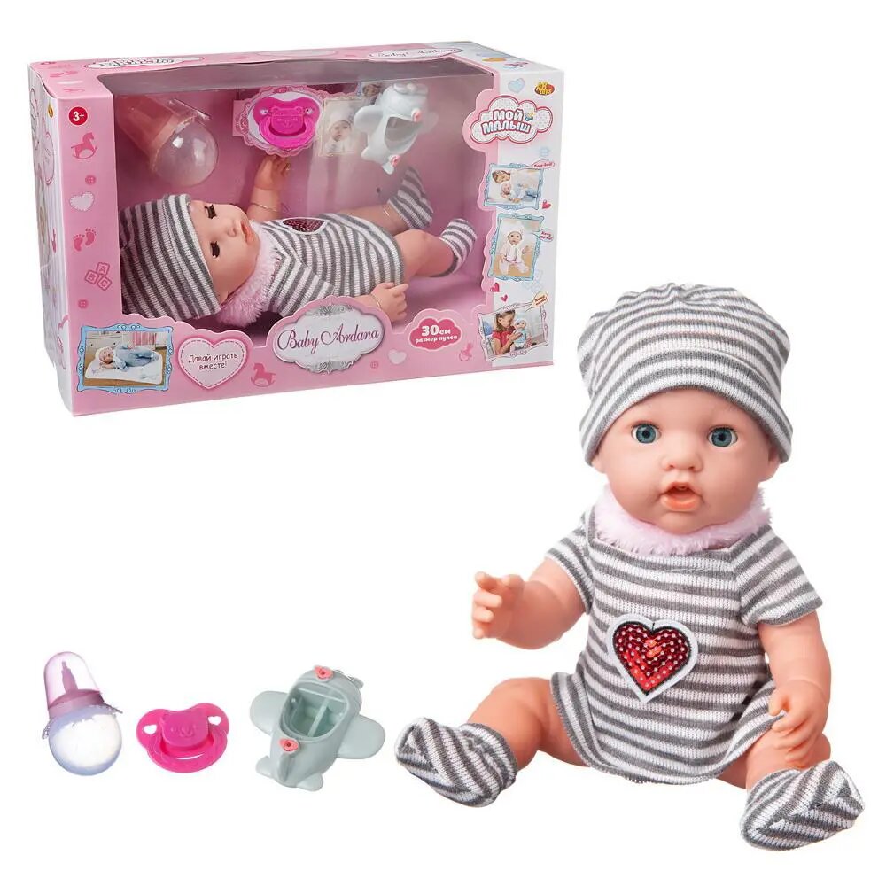 Пупс Baby Ardana, 30см, в полосатом платье, шапочке и носочках, в наборе с аксессуарами, в коробке