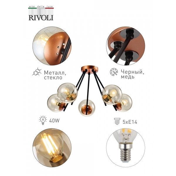 Купить Люстра потолочная Rivoli Albino под лампы 5хЕ14 40 Вт черный, медь модерн 15м2