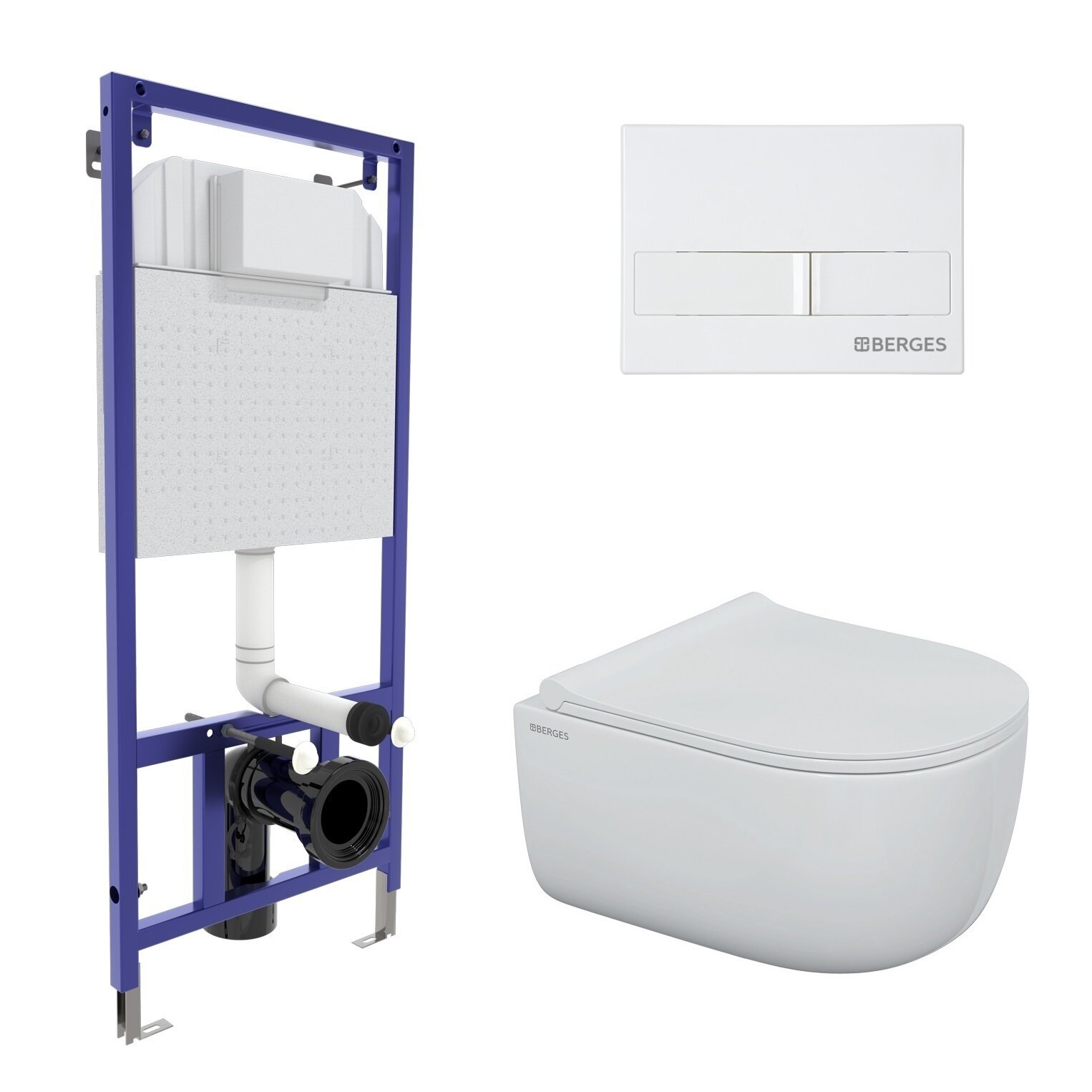 Комплект BERGES для монтажа подвесного унитаза: инсталляция NOVUM525, кнопка L1 белая, унитаз EGO XL Rimless, сиденье дюропласт Okus Slim SO, микролифт, быстросъем
