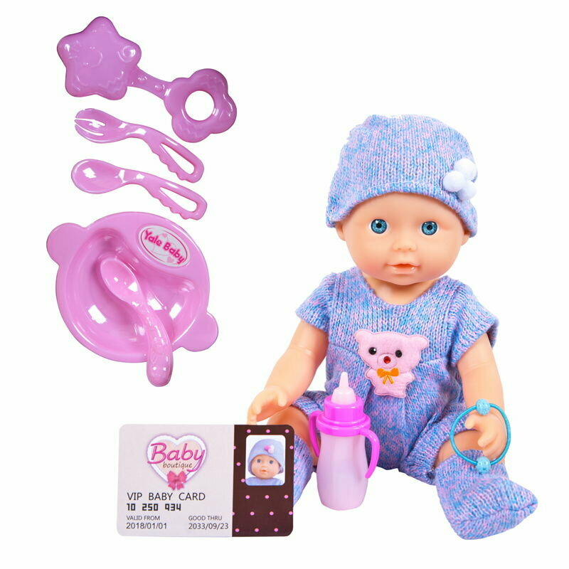 | Комплектация | - пупс; - 2 ложки; - вилка; - тарелка; - бутылочка; - персональная карточка малышки; - резинка для волос. |