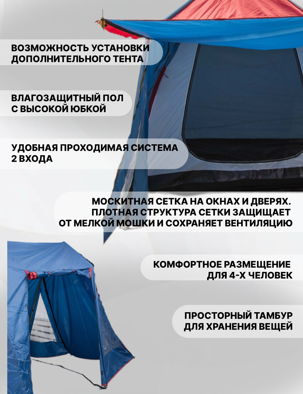 | Комплектация | возможность крепления фонарика / противомоскитная сетка / штормовые оттяжки |