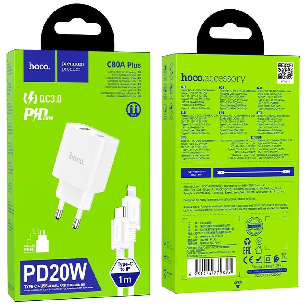 СЗУ HOCO C80A Plus Rapido 1xUSB, 1xUSB-C, 3А, PD20W, QC3.0 USB-C кабель Lightning 8-pin, 1м (белый