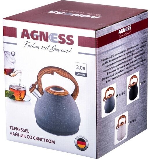 Чайник agness со свистком 3,0 л термоаккумулирующее дно, индукция