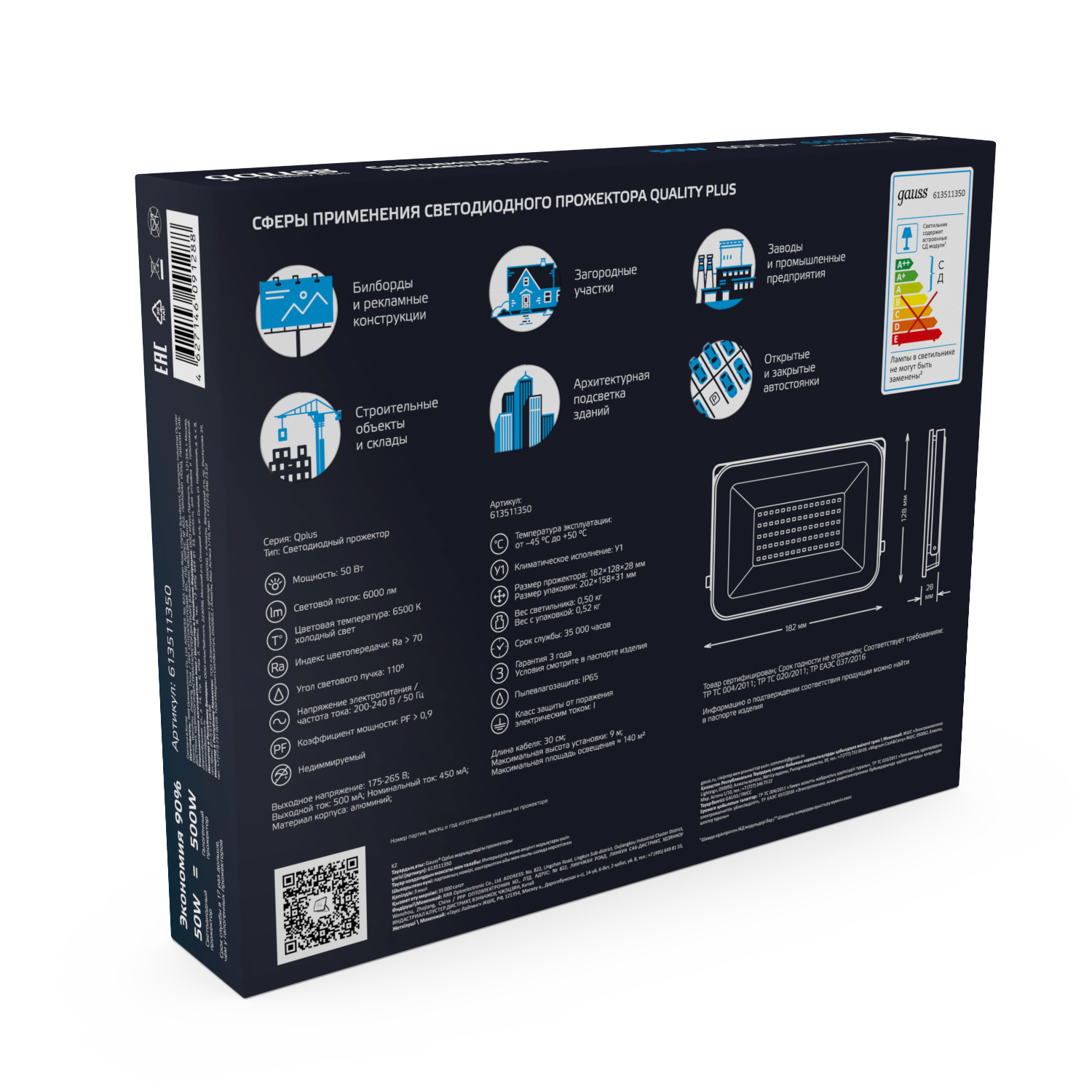 Прожектор GAUSS Qplus 50w 6000lm 6500k 175-265v ip65 черный led