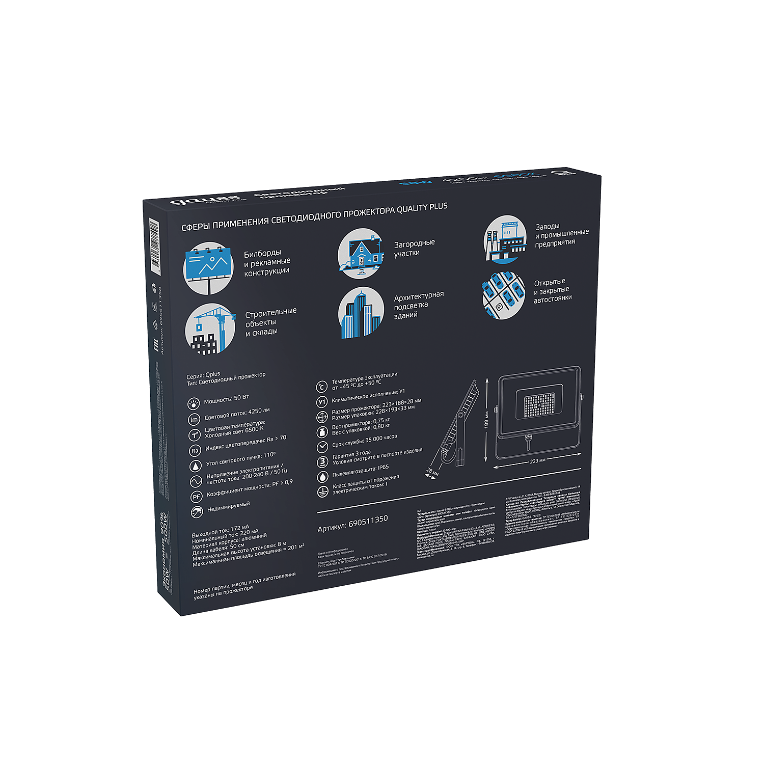 СохранитьПрожектор Gauss Qplus 50W 5250lm 6500K 200-240V IP65 графитовый LED 1/10 интересное: