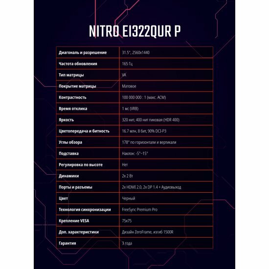 Монитор 31,5" Acer Nitro EI322QURPbmiippx 16:9 Led, VA, Curved, 2560x1440, 400 (320 native) nits, 1m .