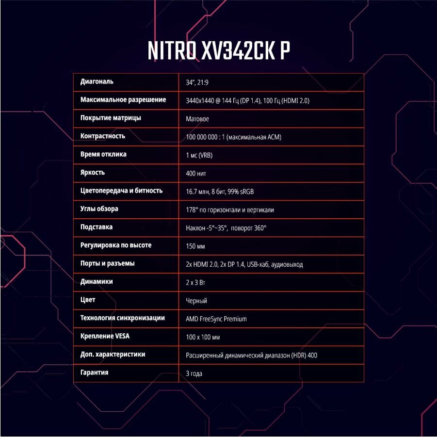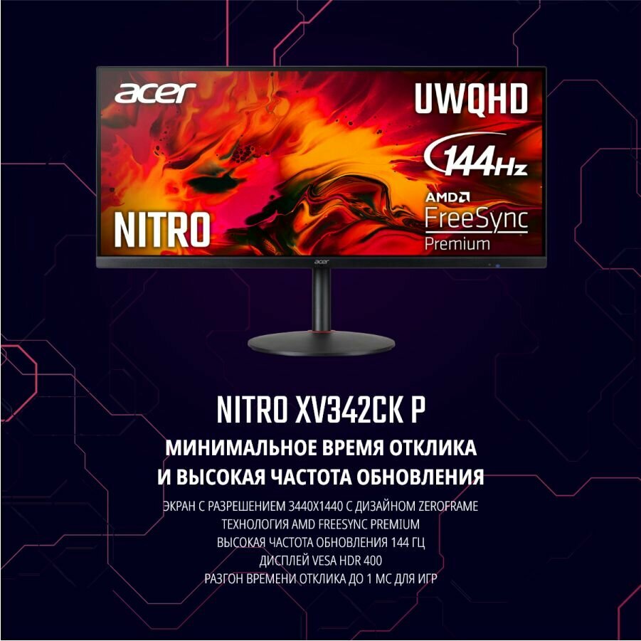 Монитор Acer 34" Nitro XV342CKPbmiipphzx 3440x1440 IPS 144Гц 1ms FreeSync HDMI DisplayPort