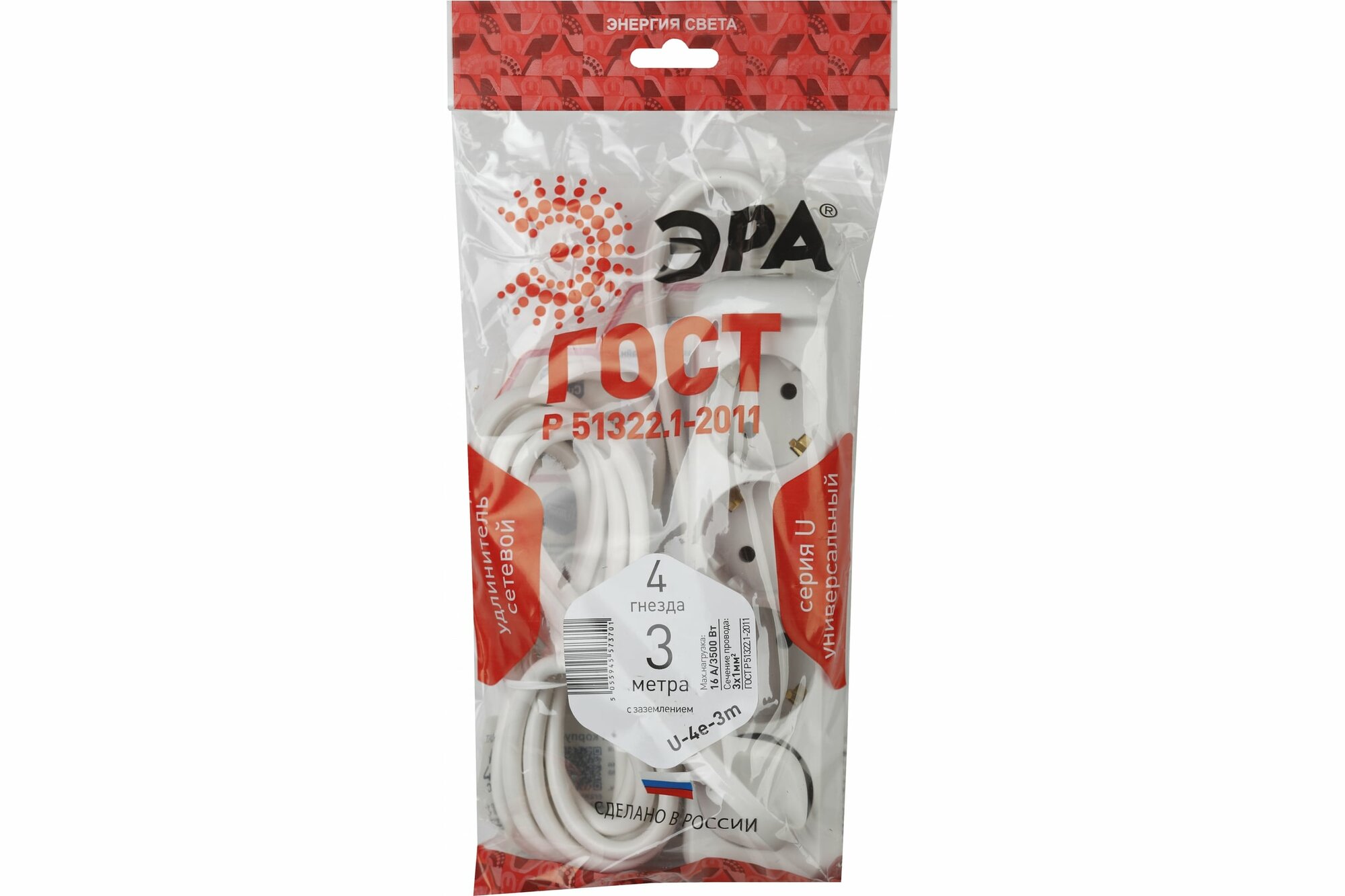 Удлинитель 4х3м с заземл. 16А IP20 U-4es-3m-3х1 ПВС 3х1 с выкл. | код.Б0028381 | Эра (2шт.в упак.)