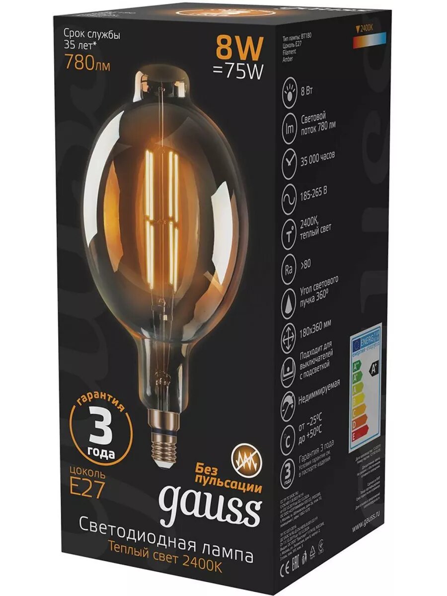 Купить Лампа Gauss Filament BT180 8W 780lm 2400К Е27 golden straight LED 1/6