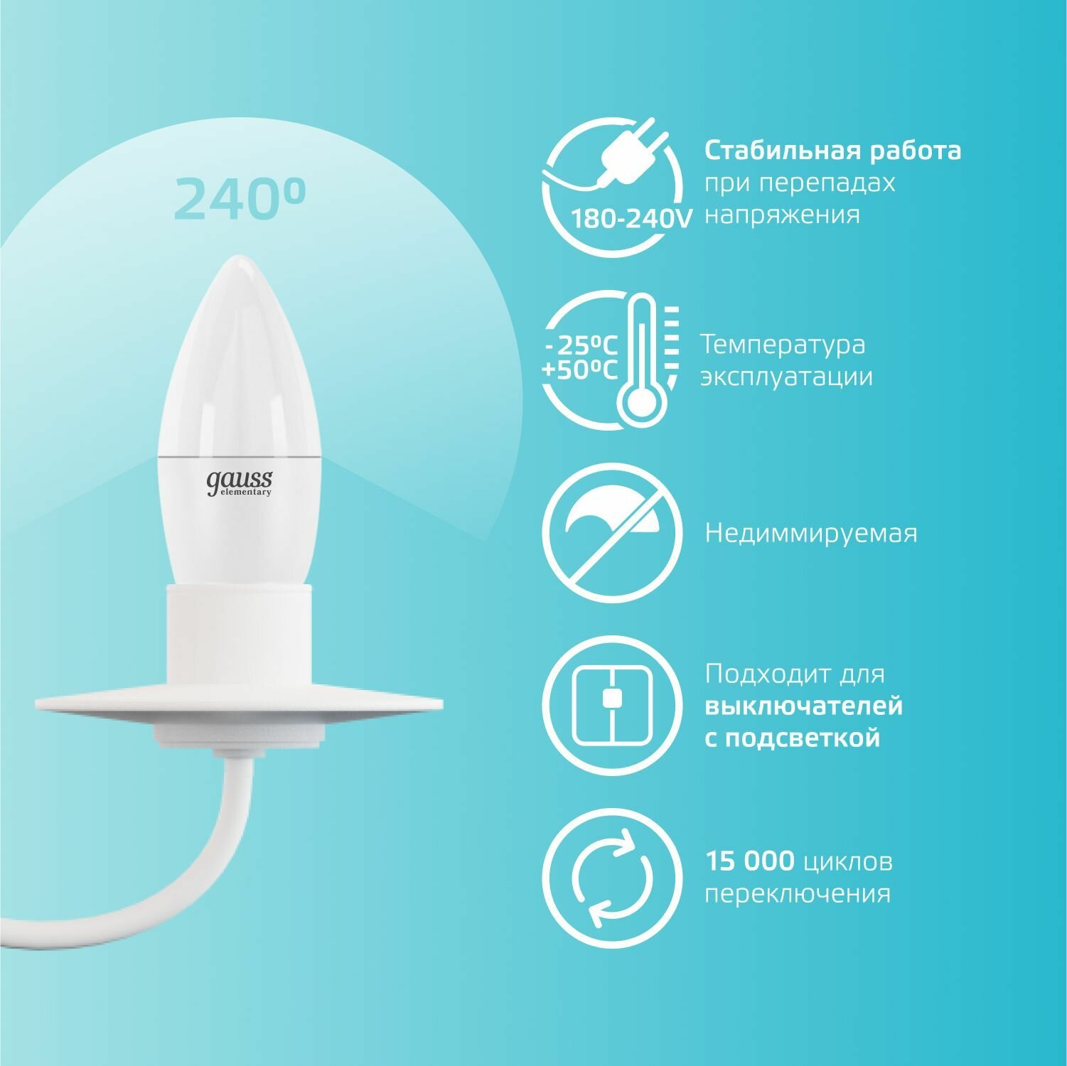 Купить Лампочка светодиодная Е27 Свеча 6W нейтральный белый свет 4100К упаковка 10 шт. Gauss Elementary