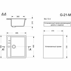 | Дополнительная информация | G-21m Односекционная мойка с отверстием под смеситель Общий размер: 550х495 мм Размер чаши: 510х360х200 мм Установочный проем: 525х470 мм. Сифон (сливная арматура) в комплектацию НЕ ВХОДИТ. |
